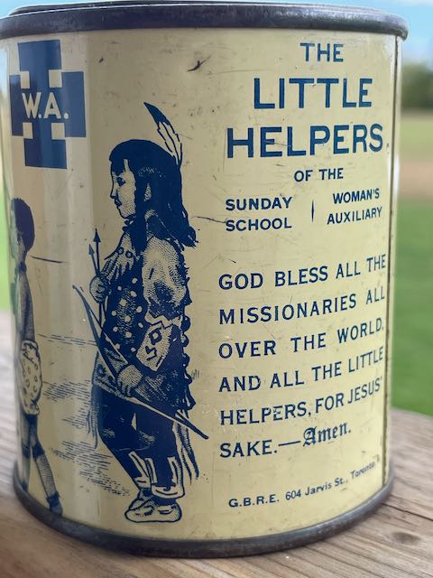 The bank belonged to Jemima “Ina” Simpson Nelms, who passed away in the summer of 2025 at just over 100 years old. As a child growing up in rural Southwestern Ontario, Ina attended St. John’s Anglican Church in Glencoe. She received the penny tin through her Sunday School program known as “The Little Helpers.” She would save her pennies and drop them into the slot, believing—as she had been taught—that the money would help “the little Indian children.”