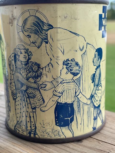 Printed on the surface are images of children from around the world, as they were depicted at the time, along with a short prayer: “God bless all the missionaries all over the world, and all the little helpers, for Jesus’ sake. Amen.” Strangely, the handsome North American Indigenous boy is standing aloof from the group. Jesus has his back to him and the child is not part of the group – he’s just watching.